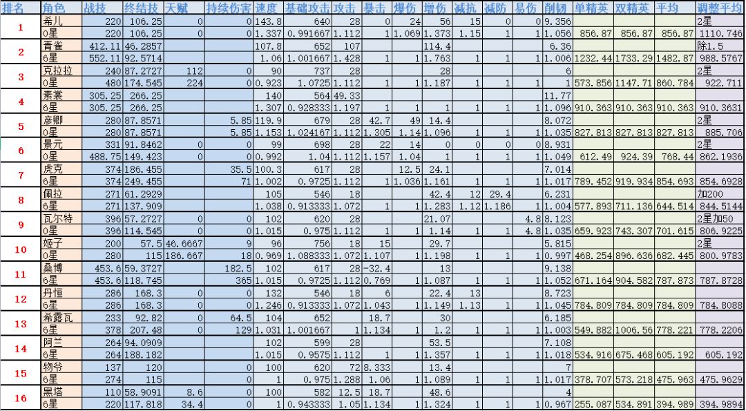 然后(战技+终结技+天赋+持续伤害)*各乘区得出最终单回合倍率。角色名字对应那行是单精英的倍率,下面那行是双精英的倍率。将单精英和双精英的倍率相加平均,就是该角色的平均倍率。5星角色都是按0星魂计算,4星角色都是按6星魂计算。调整平均就是将所有的5星角色按2星魂计算得出平均倍率。然后部分角色会再进行一定调整。下面每个角色会单独说一下。