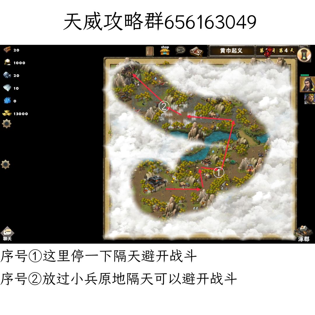 打法思路:开局选择输出做队长,装备差的可以把路上的属性增益吃了加伤害,第一天走在神庙那里就停住不要往前走可以避开敌方武将攻击我们,第二天的时候直接往上方跑,第三天攻击地图中间的风伯,打风伯的时候注意第五回合左右他会使用范围攻击伤害还挺疼尽可能避开他,打完风伯我们继续往上走会有个小兵堵在口子那里,我们带了威震四方不用和他打,这里对完话还有多余的行动力不要动了,直接过一天我们可以避开另外一个敌方武将,最后就是攻城了刘备+法系组合直接火扇烧,曹操+物理组合曹操开局传送输出进城杀。