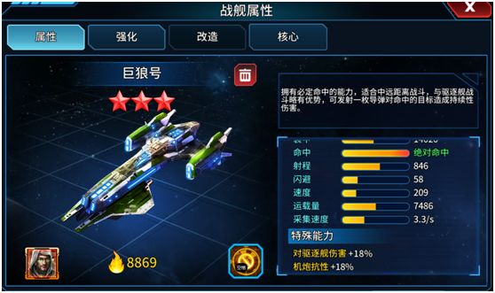 巨狼号是一艘擅长控制和输出的巡洋舰,它的攻击命中敌舰后会使敌舰无法攻击,而它的特殊技能会使敌舰持续的掉血;