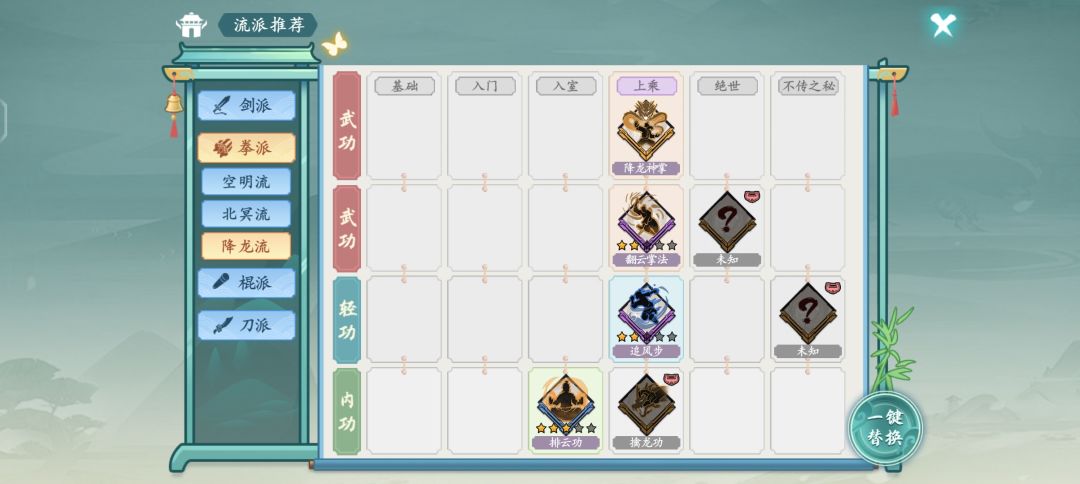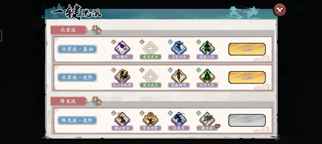 里面能够一键选择流派(图二中间下边靠左,装备鞋子左边那个,“一键流派”),基于你的抽卡的武学有哪些,有无核心卡。