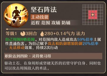 坚石阵法(主动技能):自己周围8格范围。对范围内敌人造成攻击59%倍率土属性普通伤害。为自己赋予攻击和防御增加防御20%倍率,无法移动效果,持续2次行动。