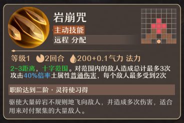 岩崩咒(主动技能):2-3距离,十字范围。对范围内的敌人造成总计最多3次攻击40%倍率土属性普通伤害,每个敌人最多受到2次。