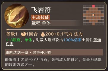 飞岩符(主动技能):1-3距离,单体。对敌人造成攻击100%倍率土属性普通伤害。