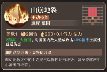 山崩地裂(主动技能):2距离,大范围。对范围内敌人造成攻击40%倍率土属性普通伤害。