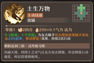 土生万物(主动技能):0-2距离,十字范围。为友方赋予攻击增加效果赋予者攻击23%倍率,移动降低1效果,持续2次行动。
