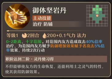 御体坚岩丹(主动技能):0-2距离,十字范围。对范围内友方造成攻击40%倍率治疗,为范围内友方赋予防御增加效果赋予者攻击5%倍率效果,持续2次行动。