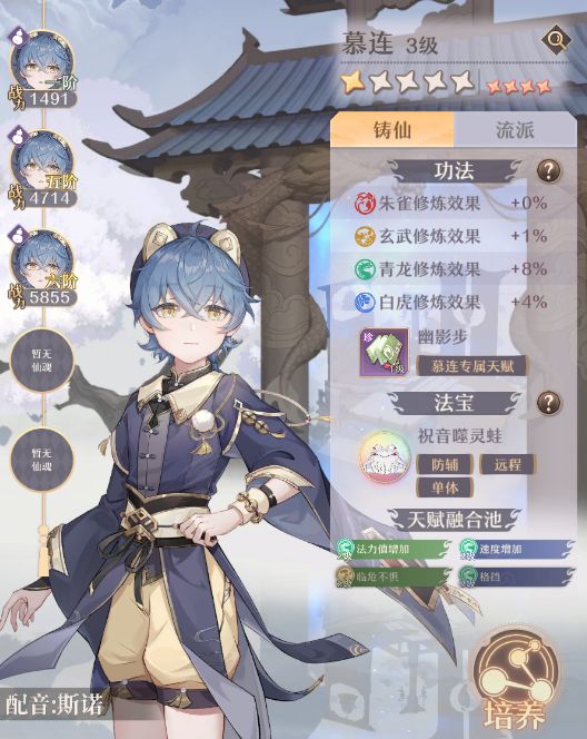 流派修正上,慕连自带土系效果增强、丹鼎效果增强20%的效果,最为契合。功法上,对青龙、白虎有着可观加成,敏捷、灵护这些属性刚好都是辅助所需要的。专属天赋“幽影步”能够根据法力上限提升速度,更快抢占先手。法宝“祝音噬灵蛙”会根据速度倍率,对敌方造成伤害,可在残局时用于补刀。天赋融合池的4个属性对站场均有提升,尤其是“临危不惧”和“格挡”大大保障了生存。