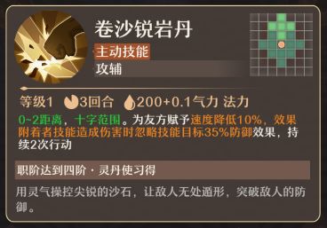 卷沙锐岩丹(主动技能):0-2距离,十字范围。为友方赋予速度降低10%,效果附着者技能造成伤害时忽略技能目标35%防御效果,持续2次行动。