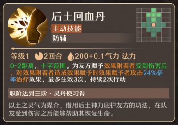 后士回血丹(主动技能):0-2距离,十字范围。为友方赋予效果附着者受到伤害后,对效果附着者造成效果赋予时效果赋予者攻击24%倍率治疗效果,最多生效3次,持续2次行动。