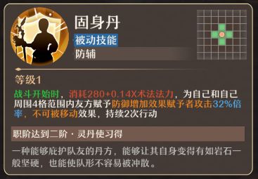 固身丹(被动技能):战斗开始时,消耗280+0.14X术法法力,为自己和自己周围4格范围内友方赋予防御增加效果赋予者攻击32%倍率,不可被移动效果,持续2次行动。