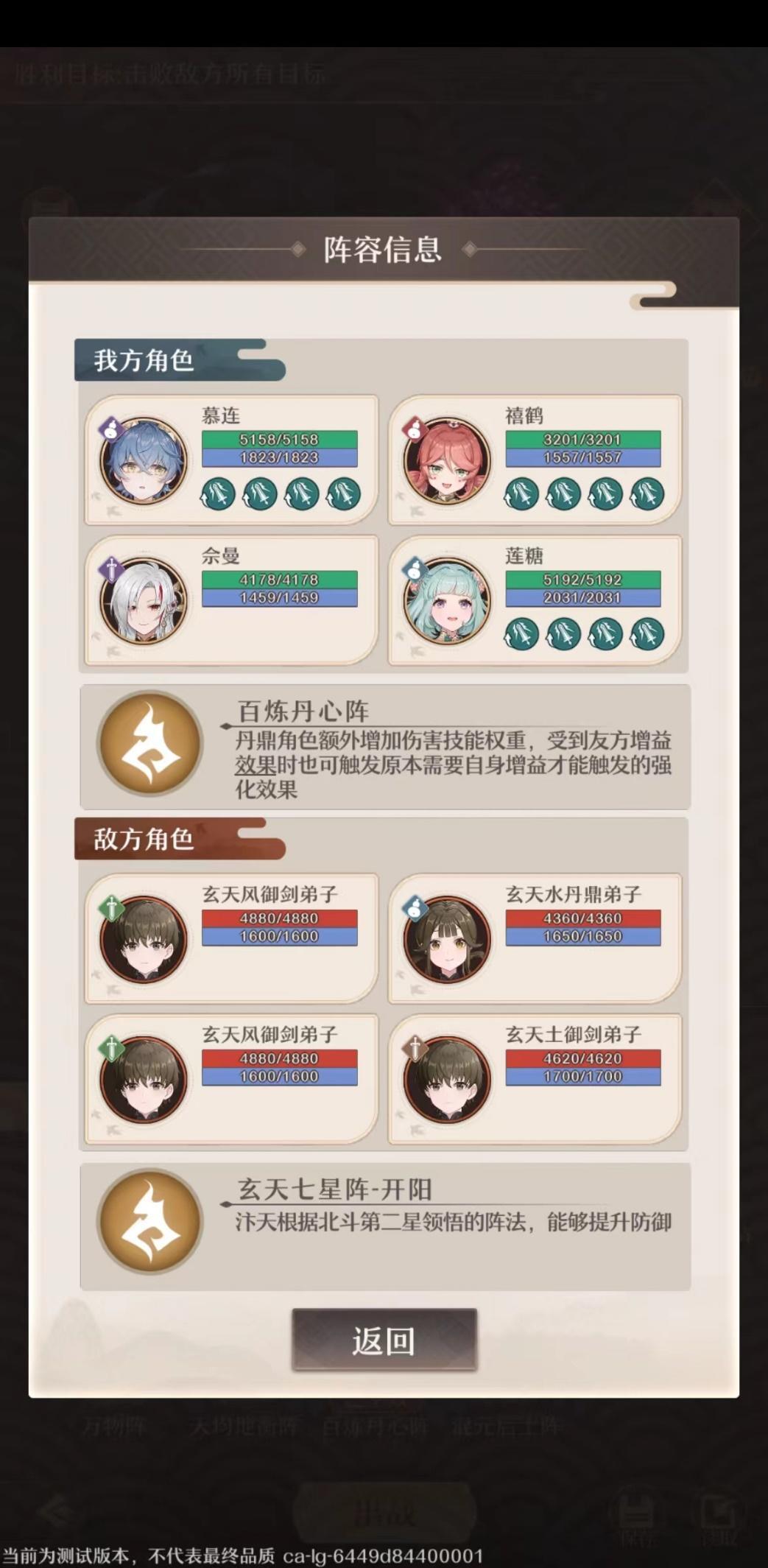 考虑到对方阵法是玄天七星阵-开阳,角色又都是防御加辅,所以我们不用太担心会暴毙的问题,但要注意对面有受击增益,所以不能选择风符类范围攻击职业。选择阵法百炼丹心阵:丹鼎角色额外增加伤害技能权重,受到友方增益效果时也可以触发原本需要自身增益才能触发的强化效果。(这个阵法需要三个丹鼎的角色,如果不够可以先去铸仙之境修炼,把战力提高到4000以上再来挑战。)