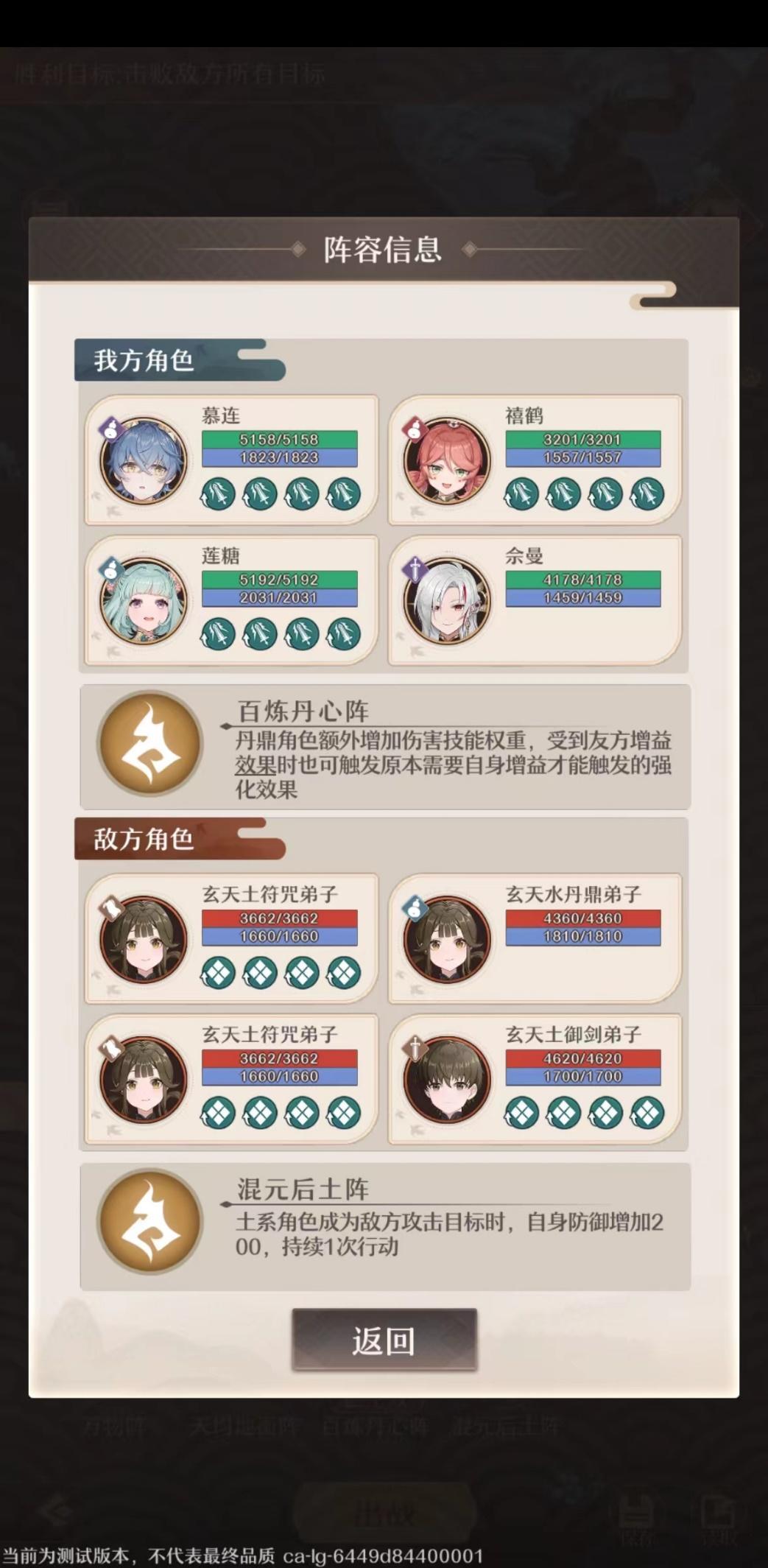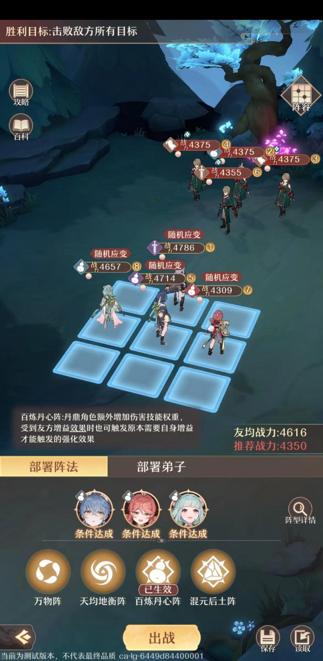 对方阵容有着不俗的防御续航能力,又有着突出的破防能力,所以我们不能陷入持久战,要速战速决。选择阵法百炼丹心阵:丹鼎角色额外增加伤害技能权重,受到友方增益效果时也可以触发原本需要自身增益才能触发的强化效果。(这个阵法需要三个丹鼎的角色,如果不够可以先去铸仙之境修炼,把战力提高到4000以上再来挑战。)