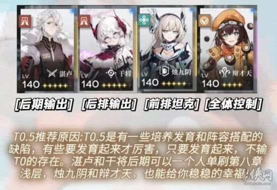 2、T0.5强度:湛卢(后期输出)、干将(后排输出)、烛九阴(前排坦克)、辩才天(全体控制)