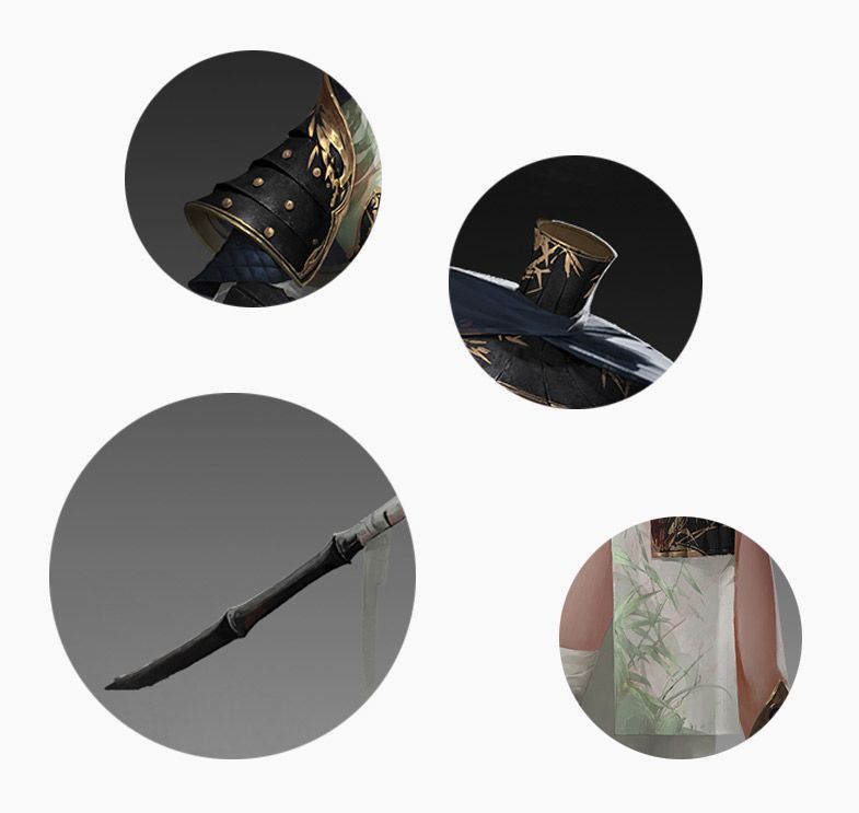 她曾隐于幽幽山林间。闲时,玄月垂眸静坐不动声色,鎏金竹纹的藏蓝头笠半遮容颜更添神秘感;动时,玄月抬手挥剑划过浮光剑影,以翠竹点缀的鹅白衣袂扬起竹叶纷飞。试问这样静若处子动如脱兔的女侠客谁不爱呢?