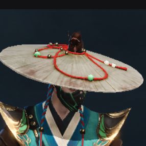 红线串碧玉点缀原本单调无华的头笠,两侧垂下的头笠绑带青红交叠,让整个装束在低调中略显张扬。