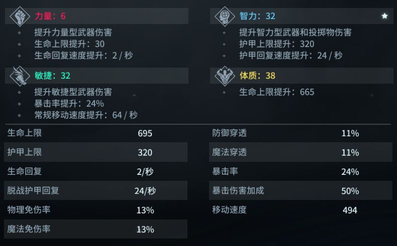 玄月的属性总体较为均衡,虽然在生命上限和回复速度上并不突出,但表现较好的敏捷和智力带来的移动速度加成和较高的护甲回复速度可以让她快速脱离战场,并在短时间内恢复状态重归战场。