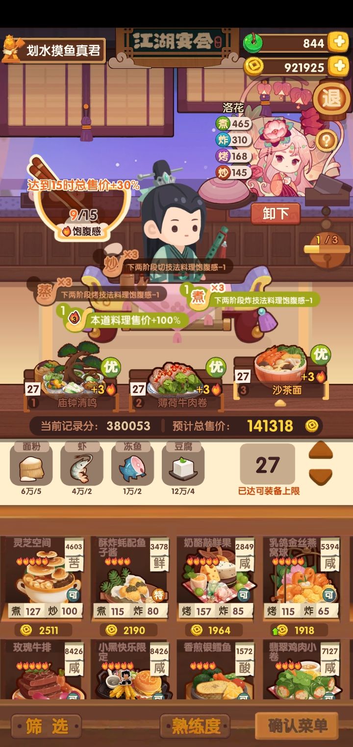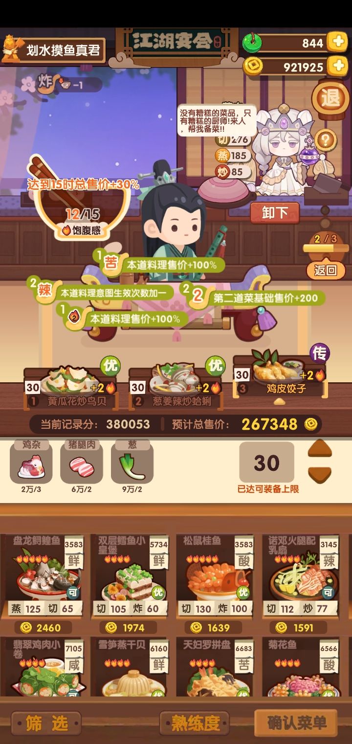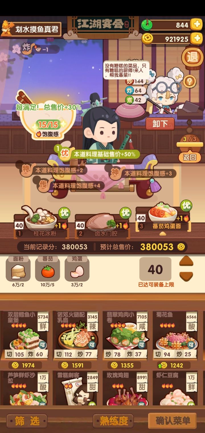 第三场:这一场主要是补足缺少的饱腹感,根据前两场灵活安排,因为这期饱腹感限制的比较低,第三场可以适当上低🔥厨子,使三道菜评级为优/可,三道菜的🔥数,选择填满饱腹感就行