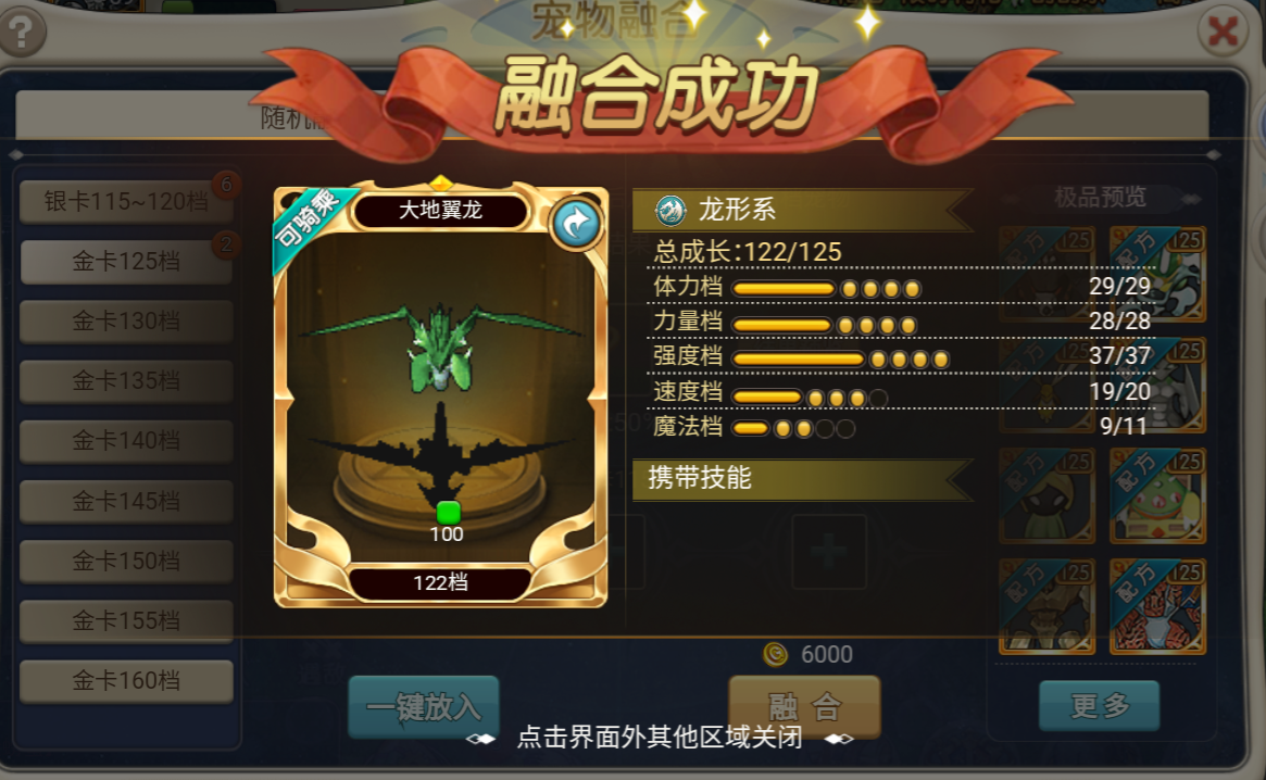 2. 合成操作方法:点击一键放入按钮后确认要把这三只合成就点击融合,但需要花费一定的金币,合成放入的宠物等级越高那么所需要的金币就越多,而且成功的概率只有一半,合成的宠物还是随机的。