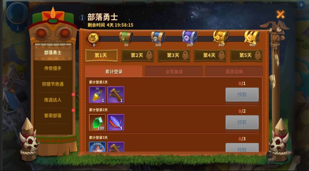 1. 累计登录赢好礼:领主大人每日登录游戏完成签到即可领取一份珍贵礼物,内含游戏道具及活动材料【不屈之木】【猎鹰之羽】。