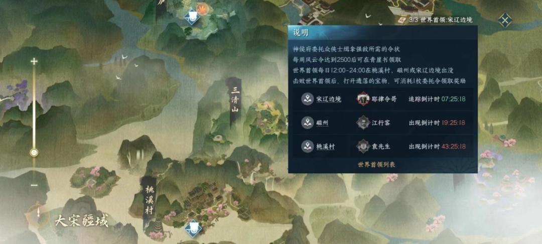 世界首领的出现时间与位置都是相对固定的,所以免去了侠友们需要四处寻找的尴尬。时间每天从上午12点出现到下午12点消失,总计12个小时。目前的世界首领有三位,分别是江行客,和阴十八寨磁州寨主,出现位置在磁州;第二位是袁先生,出现位置在桃溪村,因形貌近人,村民尊之位袁先生,但实际面貌乃是一只猿猴。第三位为耶律令哥,出现位置在宋辽边境,同为和阴十八寨磁州寨主。