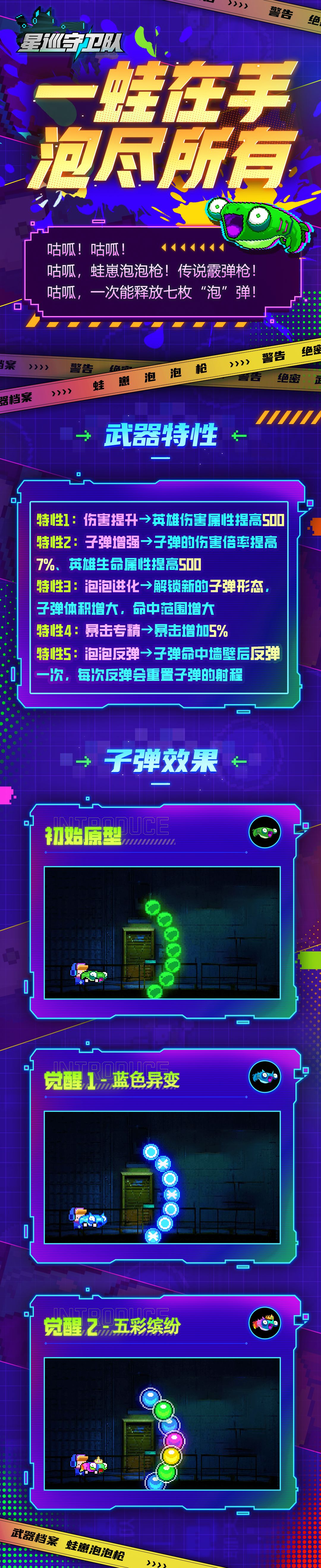 “蛙崽泡泡枪”集成了各种怪异蛙的基因数据,初始原型为普通绿色青蛙形态,武器觉醒后,“蛙”体内的某些基因将被激活,逐渐呈现出鲜艳的「警告色」(遇到颜色怪异的青蛙可不能乱摸哦!)