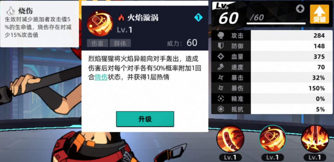 烈焰猩猩的群攻是1级1费60威力群体挂灼伤,灼伤有15%降攻。在续航压力极大的3波主线关卡中,烈焰猩猩的15%群体降攻可以说是非常好用了。