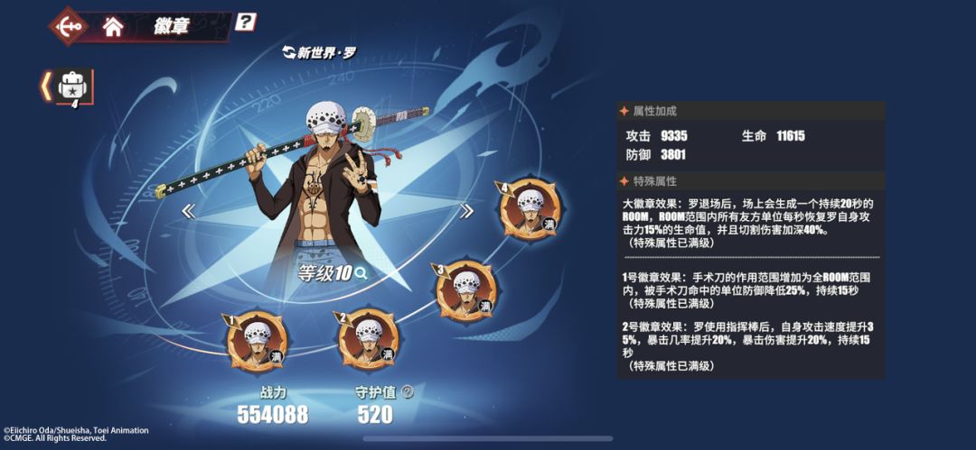 根据新世界·罗的特性效果,在组合作战的情况下,新世界·罗必须使得自身集中输出控制在10s以内;根据罗的徽章效果,长按2技能【指挥棒】,可以触发2号徽章获得暴击暴伤增益,使用1技能【手术刀】可以触发1号徽章减防效果,这决定了罗必须尽快触发2号徽章与1号徽章效果,以达到10s内输出最大化。