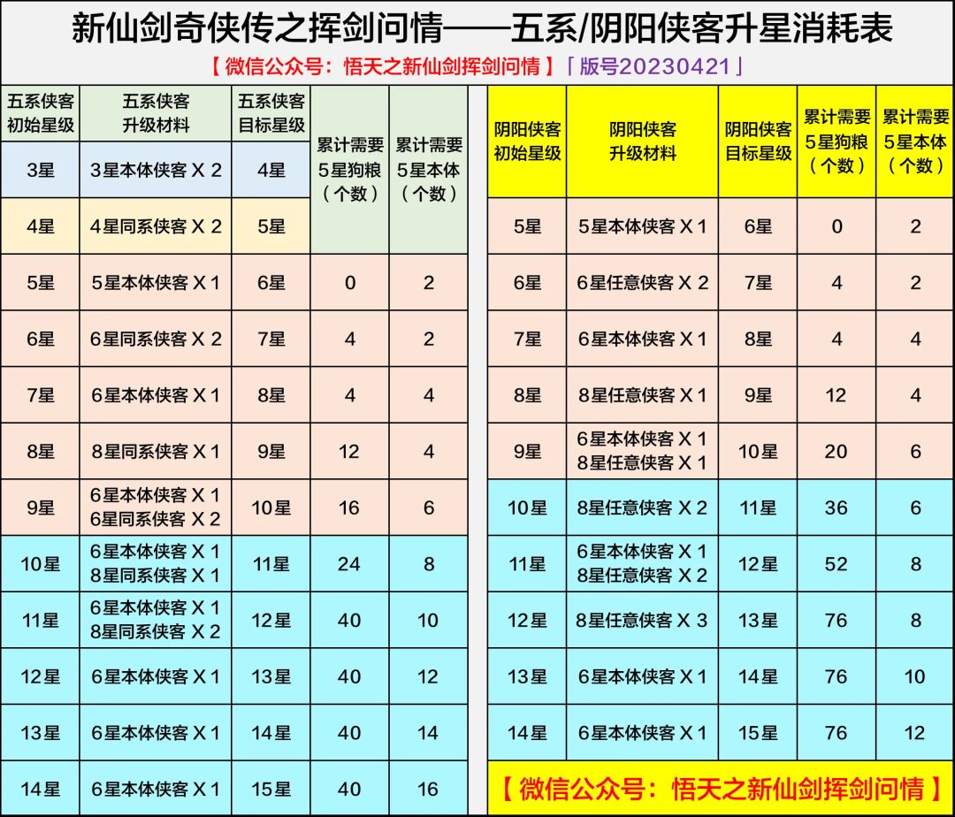 五系/阴阳侠客升星消耗表