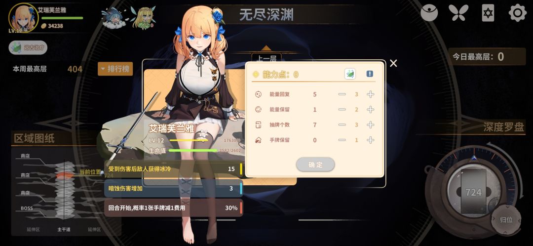 角色加点方面我选择的是7卡加点,前期容错高一点,如果追求上限高可以选择8卡加点,可以多带一张装备卡。