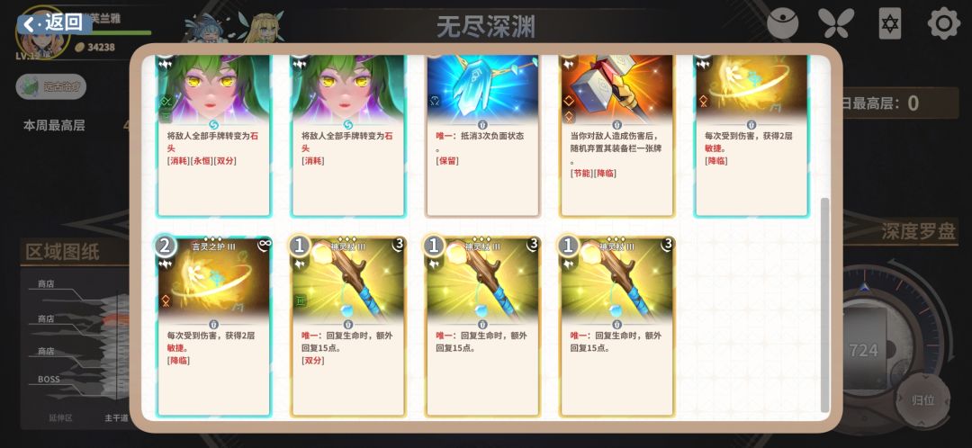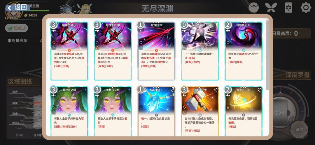 然后就是关于两张言灵之护,不光光可以闪避掉大量由美杜莎创造的石头,还能在10闪避的情况下做到无伤打出暗蚀归来清除怪物身上100层暗蚀效果配合睿智+暗蚀归也能无伤打出高达600的爆发,效果非常显著。这里提醒一下不要尝试在9闪避的时候去碰运气,不然会付出惨痛的代价不要问题是怎么知道的,600伤害的100%双反伤懂的都懂。。。。。如果你不追速通的话可以拿一张不强化的暗蚀归来大大降低反伤伤害!
