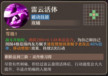 雷云活体(被动技能):战斗开始时,消耗280+0.14×术法法力,为自己和自己周围4格范围内友方赋予速度增加赋予者攻击46%倍率,移动增加1效果,持续2次行动。
