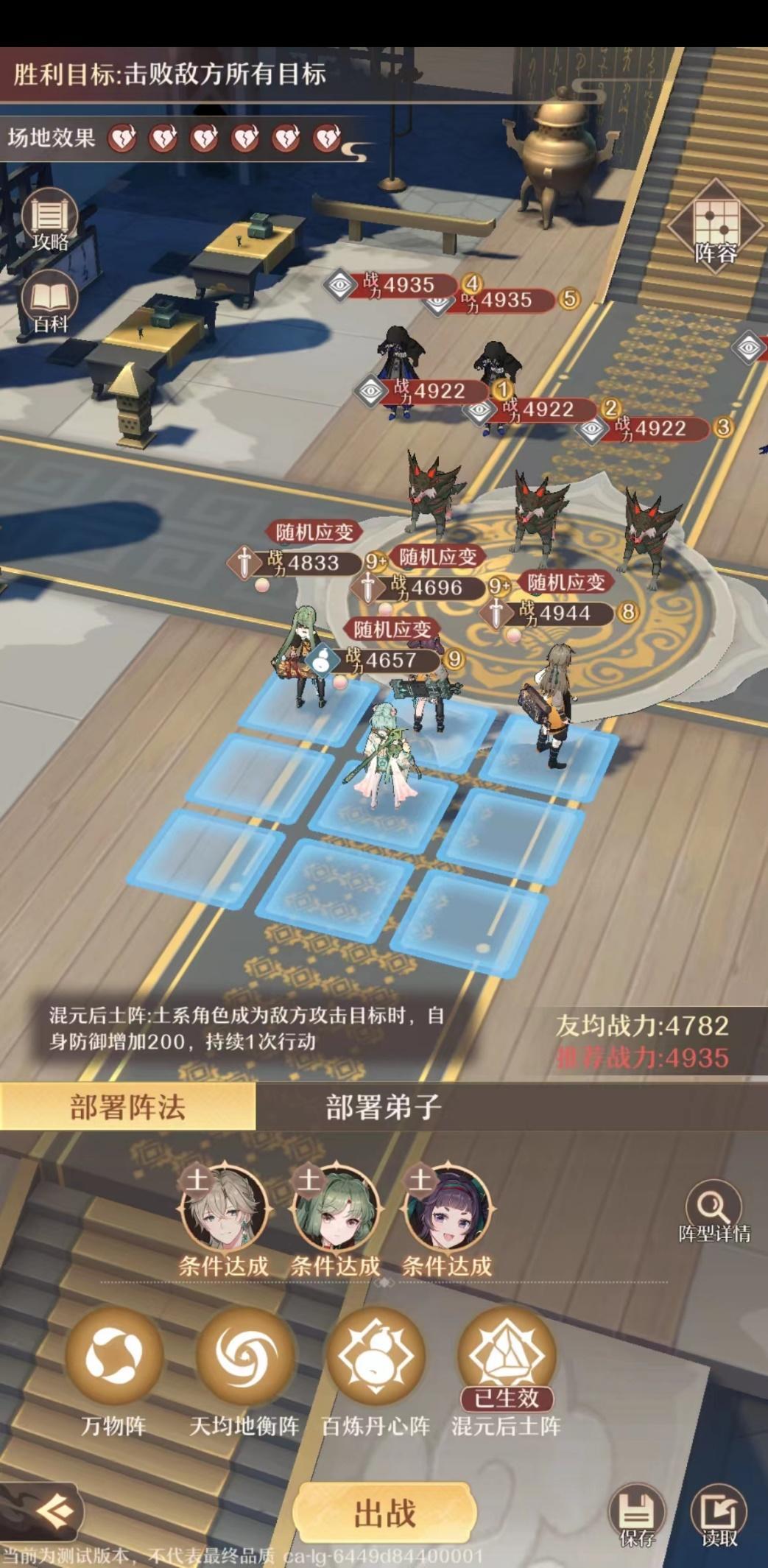 这关的敌人数量很多,又有着超高的攻击和敏捷,容易被秒杀,同时如果被拖入长时间战斗也是对我方不利的。所以我们要在保证防御足够,在能存活下来的同时兼顾输出。(本关阵法需要三个土系的角色,如果不够可以先去铸仙之境修炼,把战力提高到4500以上再来挑战。)
