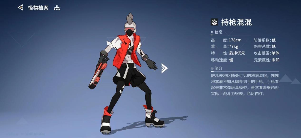 持枪混混:战力不高但讨人嫌。脏乱差地区随处可见的地痞流氓,拽拽地拿着不知从哪弄到手的手枪,手枪看起来非常像玩具模型,虽然看着很凶但实际上战斗力很差,色厉内荏。