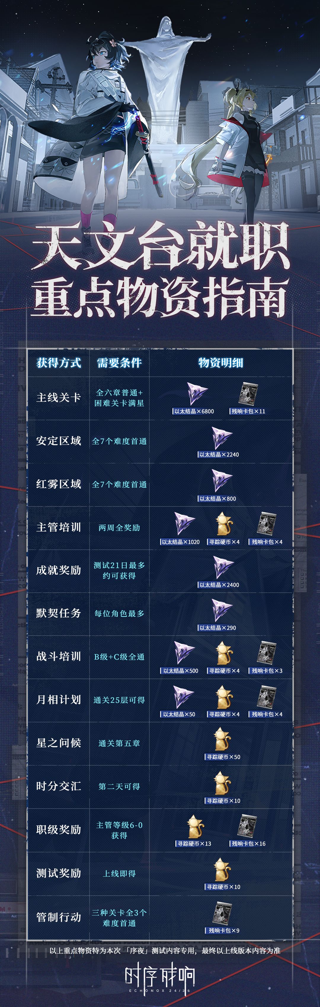 *No.X温馨提示:以上重点物资特为本次「序夜」测试内容专用,最终以上线版本内容为准