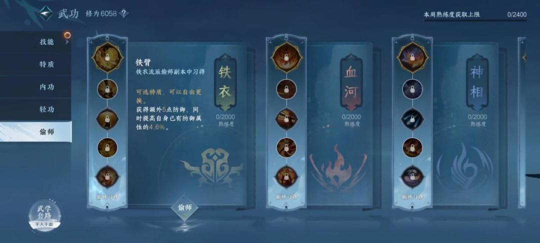 这里给血河侠友们推荐的武功带法是扫六合、铁画银钩、丹心饮意、蛟龙镇海以及追。这套武功带法强化了输出与免控能力,但防御力有所弱化,目的就是以最快的速度解决对手的前排角色。另外偷师方面推荐带上百鸟朝凤或者流行追月,作为附带破防效果的控制技能,也弥补了血河控制不足的缺点。