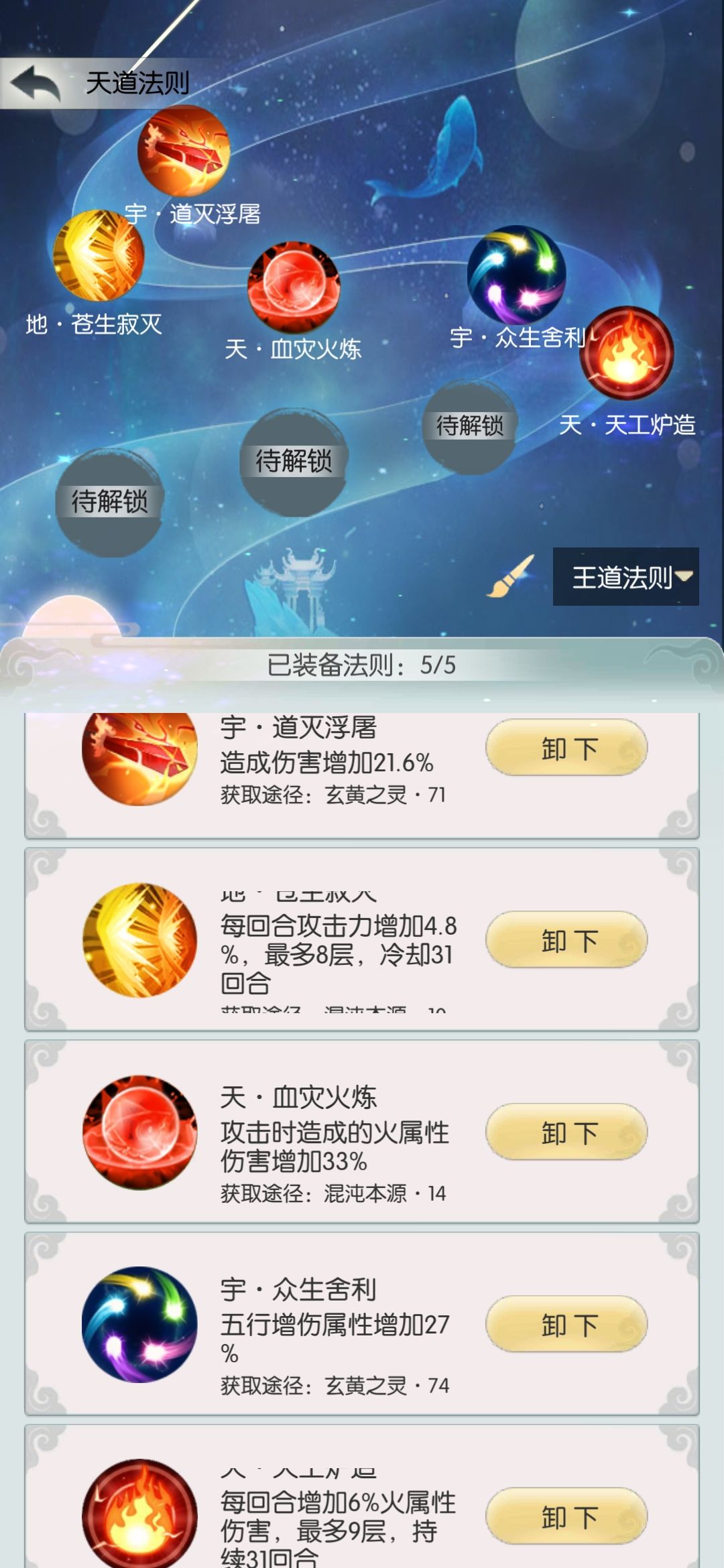 然后还有一个要点就是他直到第九回合才结束的反伤技能,如果发觉容易反死自己的道友可以把我这个苍生寂灭换成别的法则,然后主五和副五的位置调换一下什么的(虽然更多的情况是前面根本打不中然后剑破万法把反伤清了什么的)