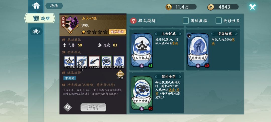 倒坐金莲必备 这是相对于上测加强了的 一级就有了固有效果 霓裳逍遥建议带 毕竟一次性叠五层 很适配皓腕玉镯和赤虬出笼 玉女扬波也建议带 可以复制寒疾 但是低等级不能指定复制给谁就很尴尬 也需要带一个起手