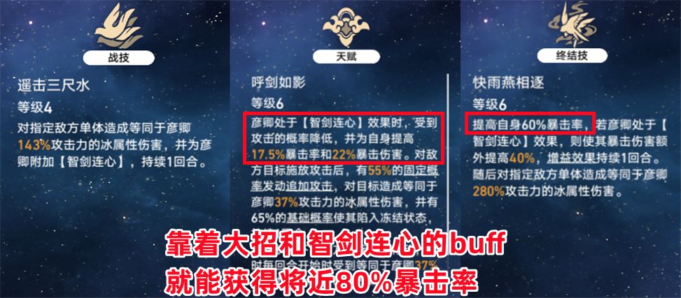 因为天赋和大招机制的关系,彦卿不缺暴击率。理论上彦卿自身暴击率到15%左右就可以做到满暴击了,所以彦卿一般只管堆暴伤即可。当然充能也很需要,因为彦卿大招能量需求高达140点,且暴击率buff只维持一回合,没有大招的话就无法维持高暴击。