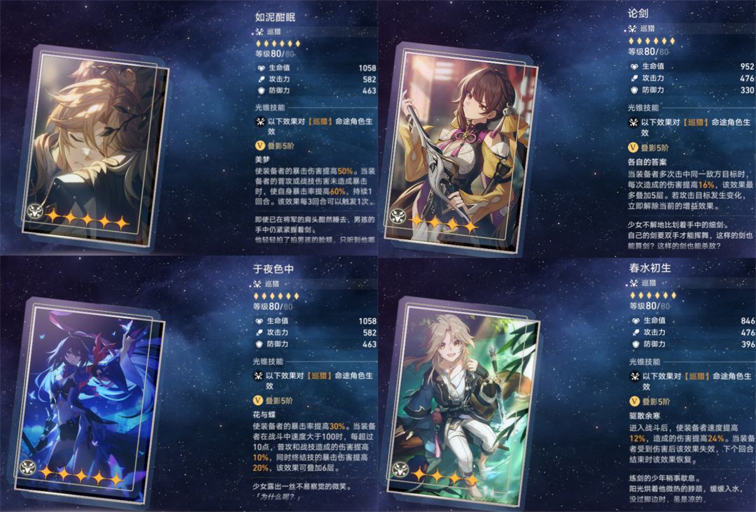 光锥方面,五星推荐彦卿专武如泥酣眠和希儿专武于夜色中,星海巡航不推荐的原因是主要加的是暴击。四星目前个人只推荐论剑,战技的多段伤害能快速叠满论剑特效,从而补足彦卿缺失的增伤区。如果上述光锥都没有,就选择可以白嫖的春水初生。