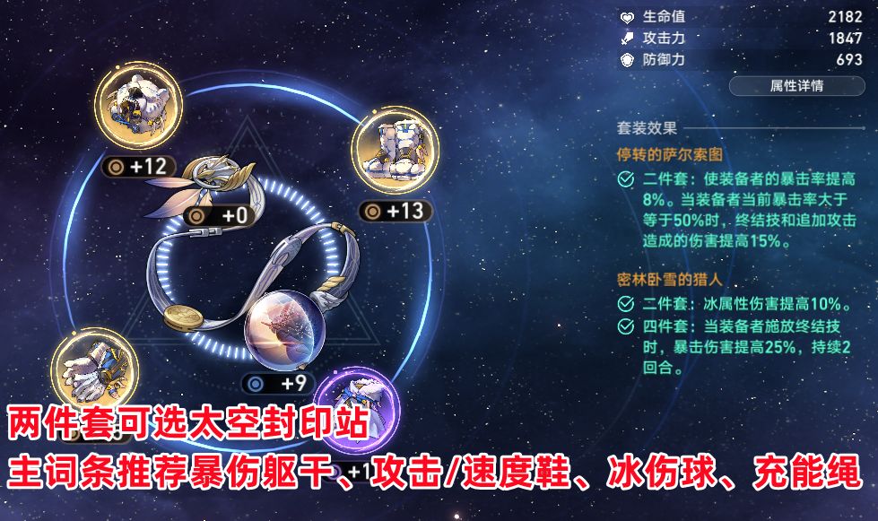 加点优先顺序为:大招>天赋>战技>普攻,三个额外能力都要点。遗器方面,首推冰套“密林卧雪的猎人”,冰伤和暴伤都是彦卿需要的属性,主词条推荐暴伤躯干、攻击鞋或速度鞋、冰伤球和充能绳。二件套推荐停转的萨尔索图或者太空封印站,虽然不太需要前者的暴击,但大招和追加攻击增伤对彦卿依然有用,如果感觉暴击溢出过多就选后者。