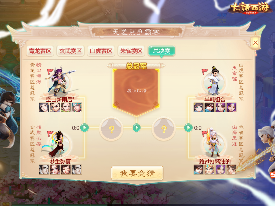 第四届大话手游无差别PK赛已经进入了最后的阶段,目前青龙、白虎、朱雀、玄武四大线上赛区冠军队伍已分别出炉,来自青龙赛区的“空山新雨后”战队、玄武赛区的“梦生弥真”战队、白虎赛区的“半吨组合”战队以及朱雀赛区的“路过打酱油的”战队四只强力队伍成功在分赛区角逐中脱颖而出,他们将代表各自的赛区前往无差别争霸赛全国总冠军的决赛擂台上,争夺最终的冠军大奖!