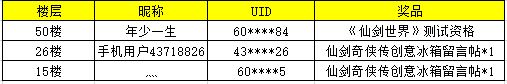 让我们一起来揭晓本次获奖的少侠名单吧,没中奖的少侠也不用灰心,攒运气等爆发,相信下一个中奖的就是你,感谢各位少侠们对《仙剑世界》的支持!