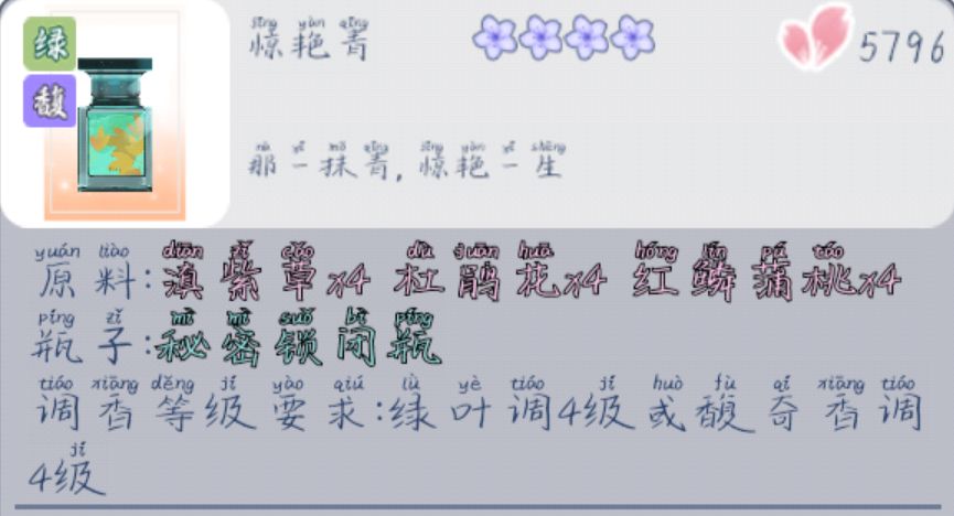 惊艳青(7534黑花瓣),一级价格5796,秘密锁闭瓶子447,材料滇紫草(66黑/15/36秒)、杜鹃花(111黑/11/59秒)、红鳞蒲桃(97黑/16/59秒)