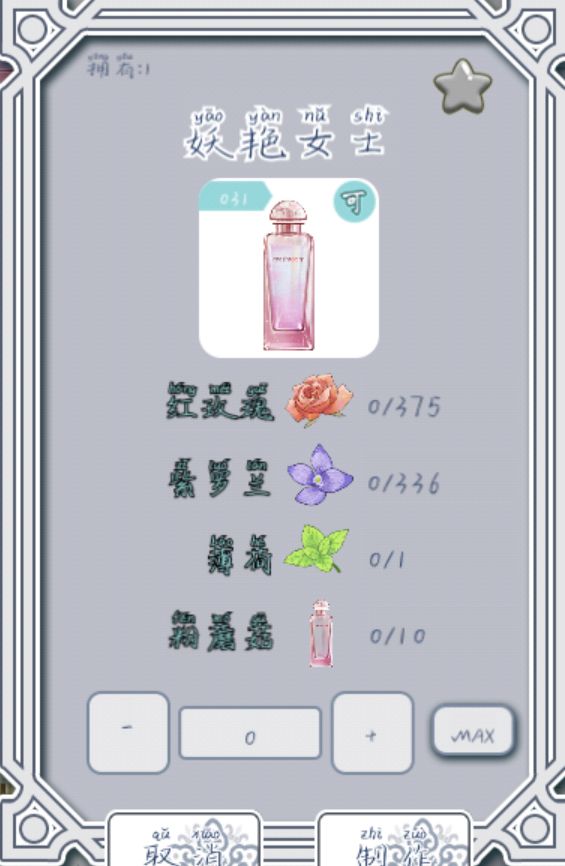 一级推荐用迷烟情事,初始价格696,特级904,价格不高,但是刷起来很快,材料是红玫瑰(64花瓣/10朵/六秒一朵)、黑玫瑰(90/10/八秒一朵)、白玫瑰(77/8/六秒一朵),海之月的牌子最低价二百多。种子价格低,刷得嘎嘎快(我是一次性刷了五百瓶,所以不清楚刷到特级要多少瓶)