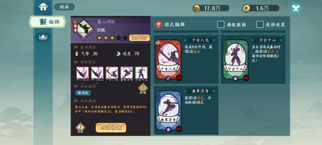 作为仅有的两本暴击功法(且唯一的紫色功法),嵩山剑法因其好抽的特点容易升星;