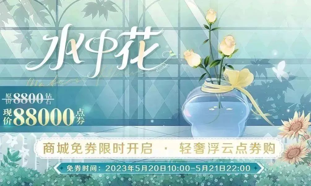 5月20日5:00,轻奢浮云-水中花也将上架商城!售价为8800钻石的浮云,在商城免券购期间(5月20日10:00至5月21日22:00),限时售卖88000点券!