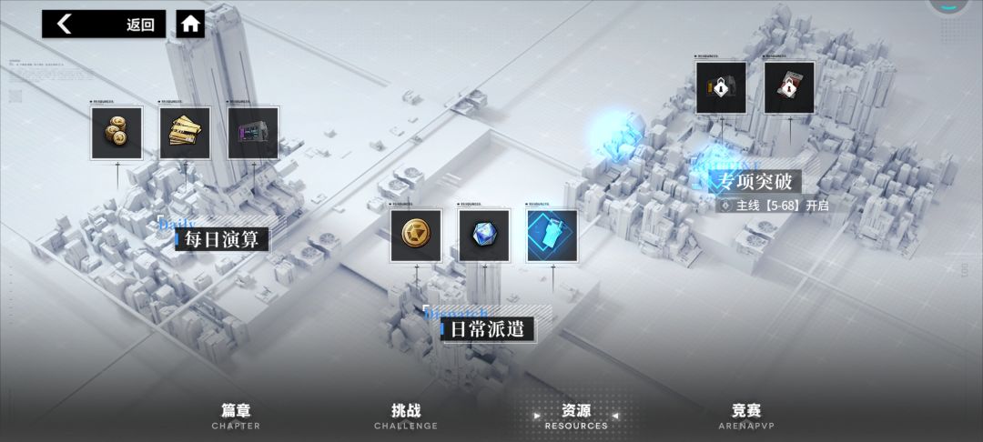 另外推图推不动时候就去作战里推性能考级,那个推也是给很多资源,那个推不动了再升级卡试试推图。我刚开始也经常找不到,容易把这个忽略。
