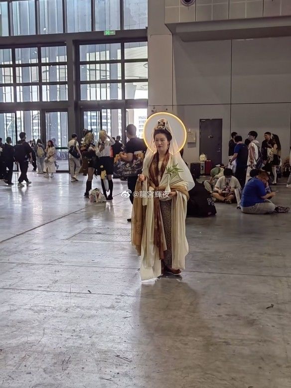最意外的当属女菩萨,不但扮相颇有一丝宝相庄严的味道,手持玉净瓶,甚至还自带“佛光”,引得现场不少人顶礼膜拜。