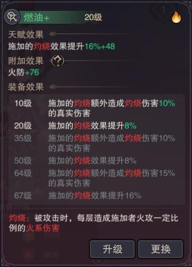 3.燃油:可提高灼烧效果并让被灼烧者受到伤害时附加一定量的真实伤害(满级灼烧效果+48%,附加真实伤害+35%)