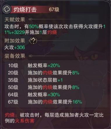 7.燃火盔甲:受到攻击可对敌人造成一次火焰伤害并叠加一层灼烧效果,让对面基本永远都处于灼烧状态,此天赋施加灼烧效果时敌方在攻击范围内可追加一次普通攻击造成15%伤害(这时肯定有比较骚包的同学要吐槽追加伤害太低了还有范围限制,但可以配合融火追加攻击主要是配合灼烧打击和燃油的灼烧效果加成来触发灼烧打火焰伤害,也可以在回合外触发连击来帮助火炎叠加和使用被动层数)